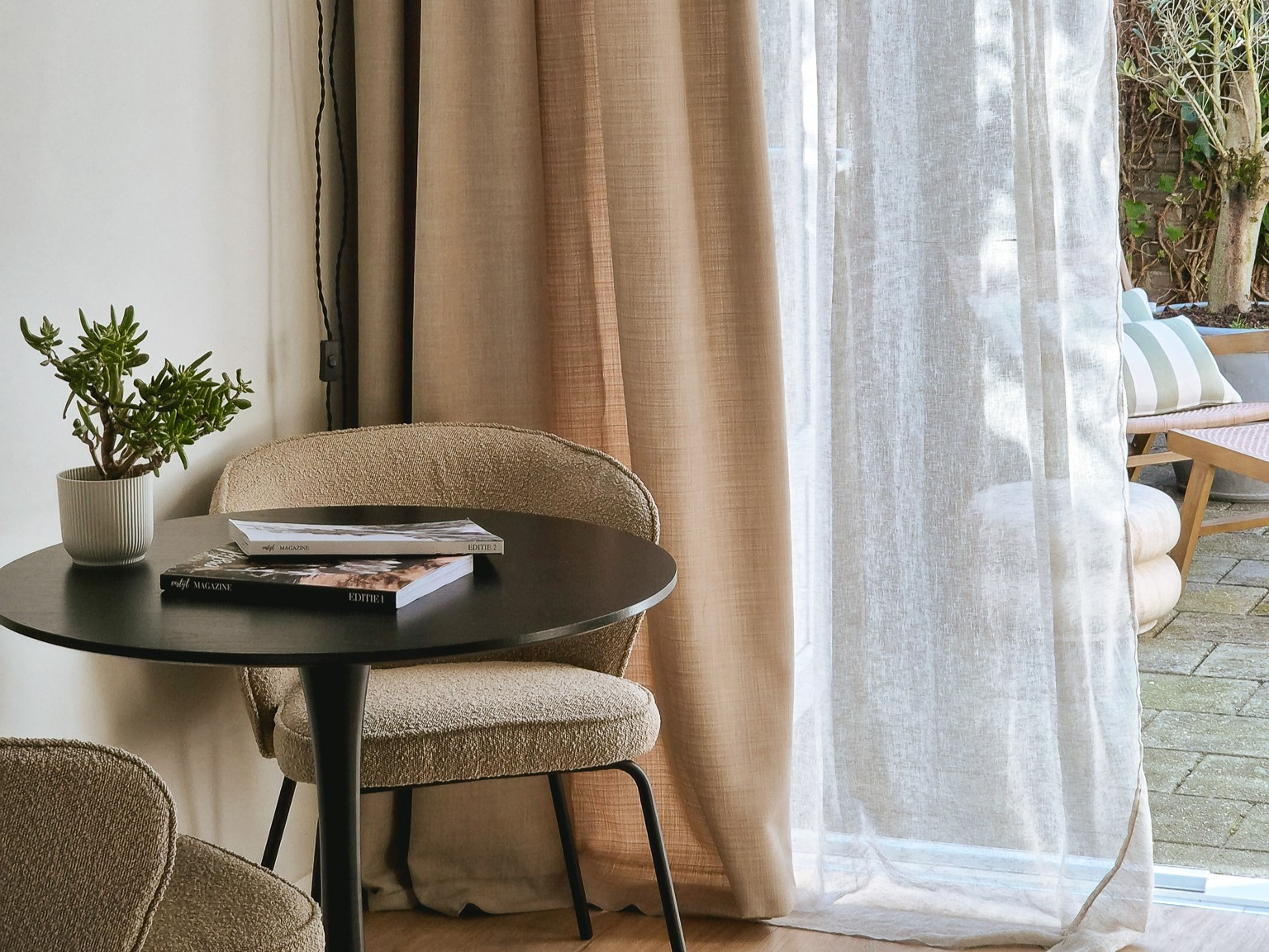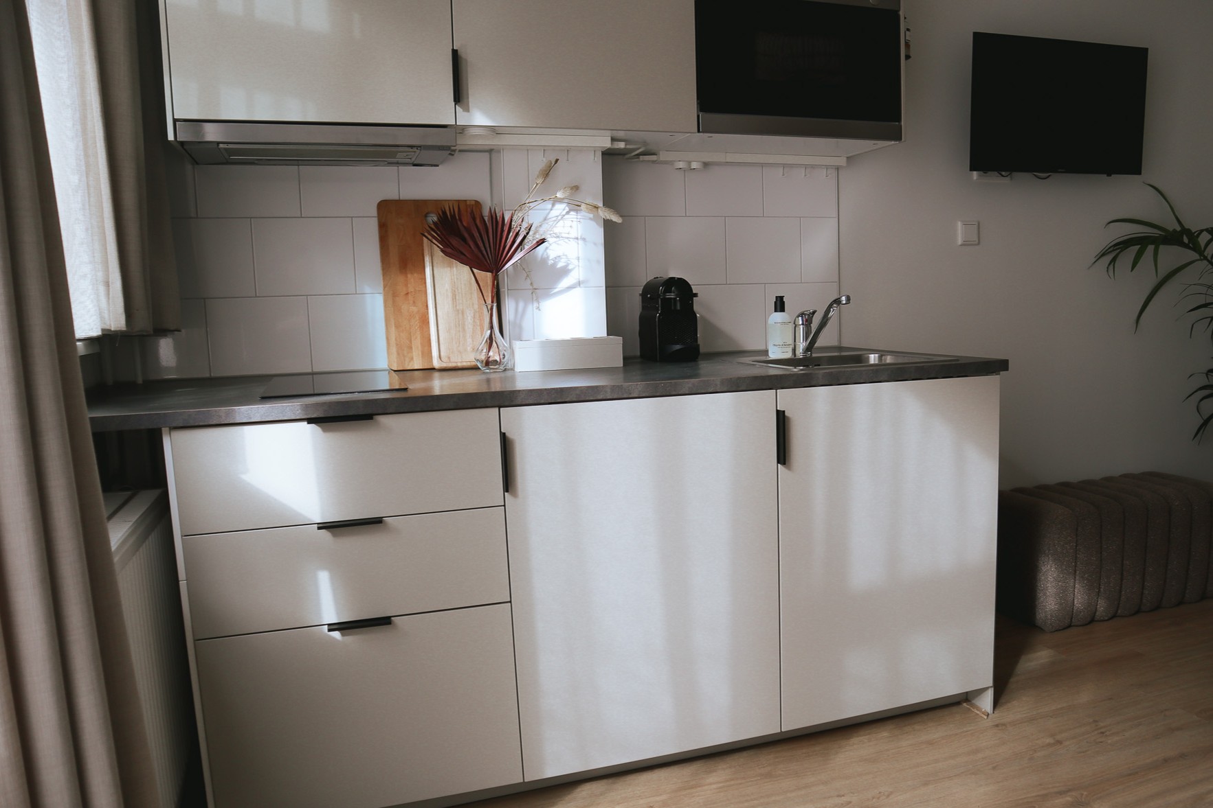 Dieses Studio ist für 2 Personen. Die Küche ist mit verschiedenen Geräten ausgestattet, darunter eine Mikrowelle, Nespresso Kaffeemaschine, Induktionsherd und ein komplettes Kücheninventar. Angrenzend befindet sich das Badezimmer mit Dusche, Waschbecken und Toilette. Das Studio verfügt über einen eigenen privaten umzäunten Garten mit schönen Gartenmöbeln.